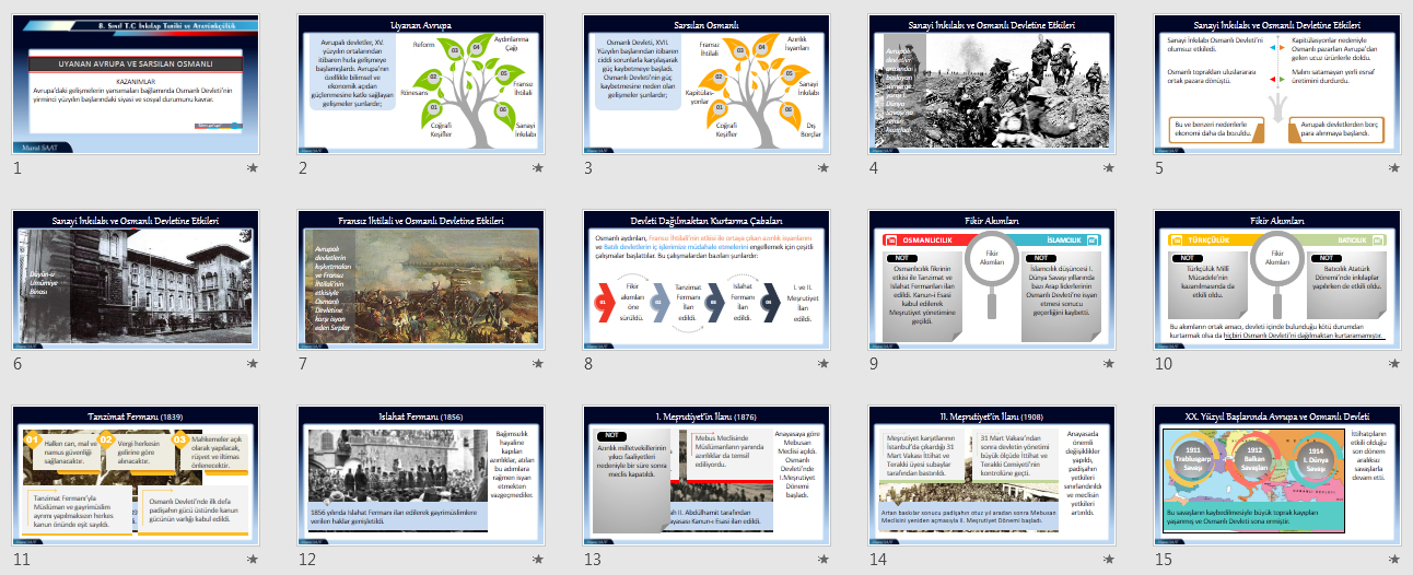 Hocam öncelikle emeğinize sağlık çok güzel olmuş lakin bazı bölümler anlatılırken harita olsa daha anlaşılır olurdu örnek milliyetçilik isyanıyla Osmanlı içindeki azınlıklar isyan etti sonrasında bir harita üzerinde hangi devletlerin isyan ettiklerini göstermek gerekir diye düşünüyorum benimkisi sadece bir öneri çalışmalarınız çok güzel elinize sağlık