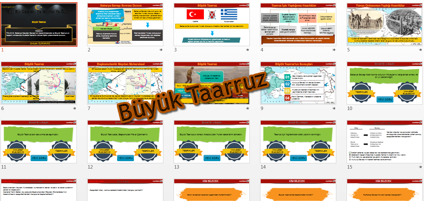 "İTA.8.3.5. Sakarya Meydan Savaşı’nın kazanılmasında ve Büyük Taarruz’un başarılı olmasında Mustafa Kemal’in rolüne ilişkin çıkarımlarda bulunur." kazanımı için hazırlanan sunudur.