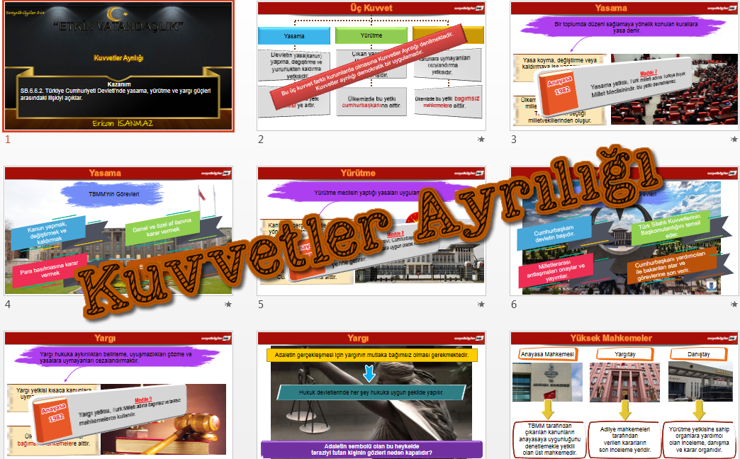 "SB.6.6.2. Türkiye Cumhuriyeti Devleti’nde yasama, yürütme ve yargı güçleri arasındaki ilişkiyi açıklar." kazanımı için hazırlanan sunudur.