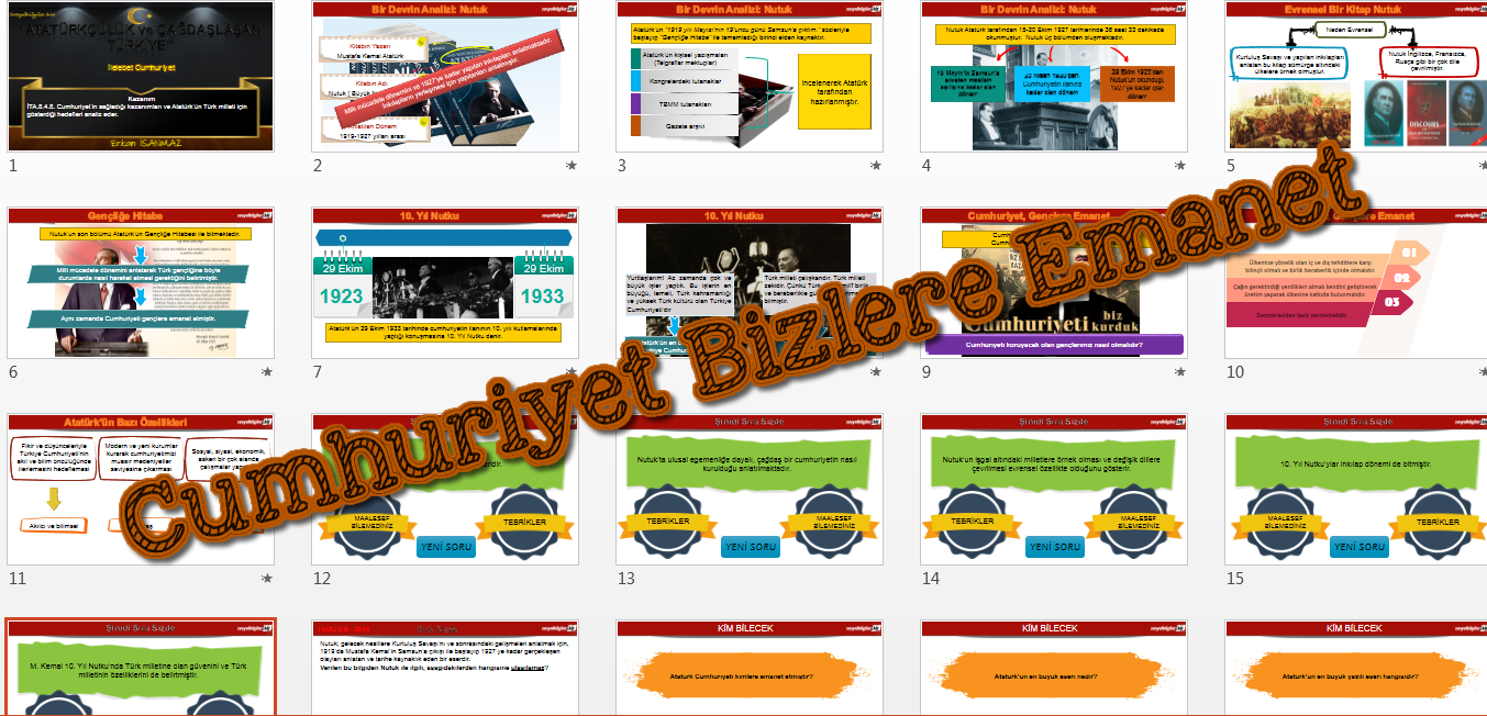 "İTA.8.4.8. Cumhuriyet’in sağladığı kazanımları ve Atatürk’ün Türk milleti için gösterdiği hedefleri analiz eder." kazanımı için hazırlanan sunudur.
