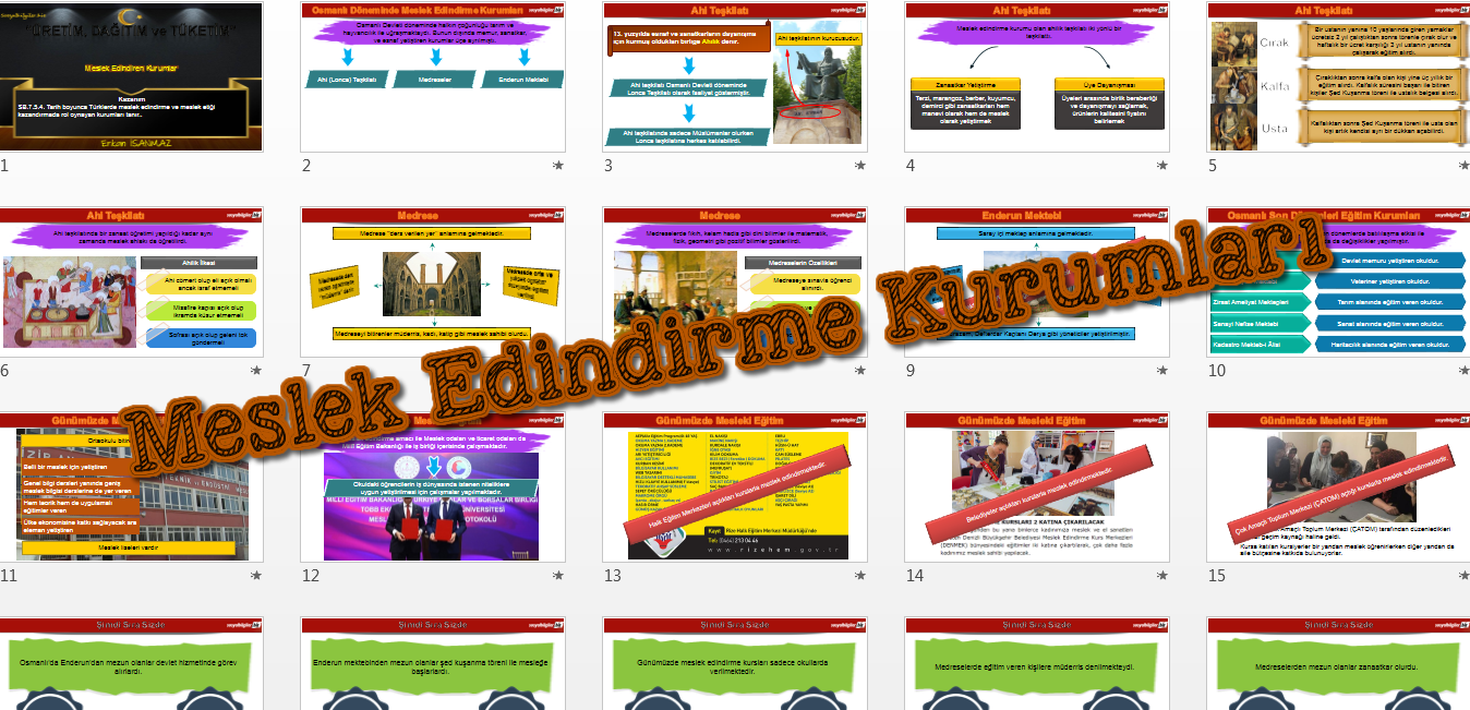 "SB.7.5.4. Tarih boyunca Türklerde meslek edindirme ve meslek etiği kazandırmada rol oynayan kurumları tanır." kazanımı için hazırlanan sunudur.