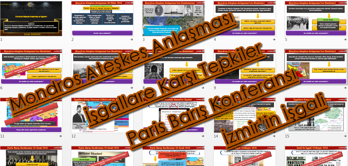 "İTA.8.2.3. Mondros Ateşkes Antlaşması’nın imzalanması ve uygulanması karşısında Osmanlı yönetiminin, Mustafa Kemal’in ve halkın tutumunu analiz eder." kazanımı için hazırlanan sunudur. Ekli dosyayı görüntüle 28874