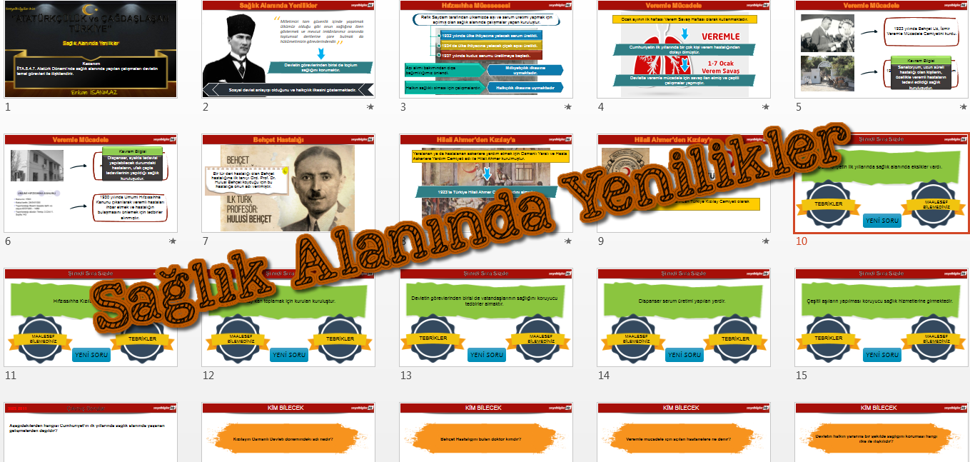 "İTA.8.4.7. Atatürk Dönemi’nde sağlık alanında yapılan çalışmaları devletin temel görevleri ile ilişkilendirir." kazanımı için hazırlanan sunudur.