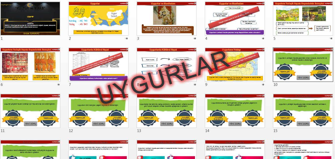 "SB.6.2.1. Orta Asya’da kurulan ilk Türk devletlerinin coğrafi, siyasal, ekonomik ve kültürel özelliklerine ilişkin çıkarımlarda bulunur." kazanımının Uygurlar bölümü için hazırlanan sunumdur.