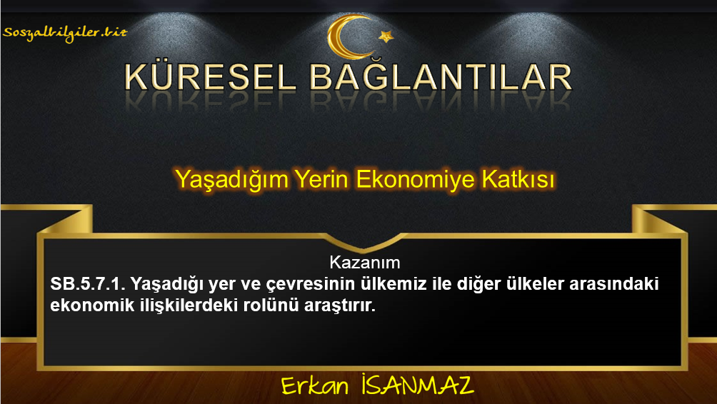 "SB.5.7.1. Yaşadığı yer ve çevresinin ülkemiz ile diğer ülkeler arasındaki ekonomik ilişkilerdeki rolünü araştırır." Kazanımı için hazırlanmış sunumdur.