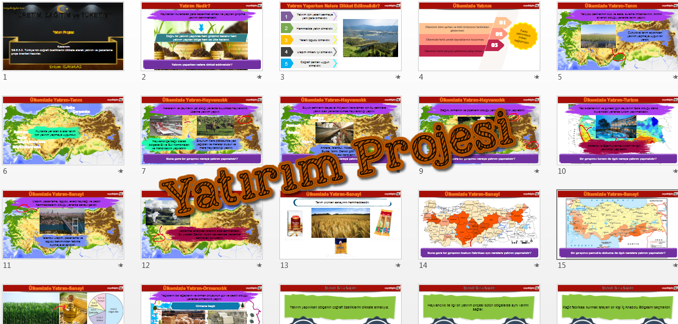 "SB.6.5.3. Türkiye’nin coğrafi özelliklerini dikkate alarak yatırım ve pazarlama proje önerileri hazırlar." kazanımı için hazırlanan sunudur.
