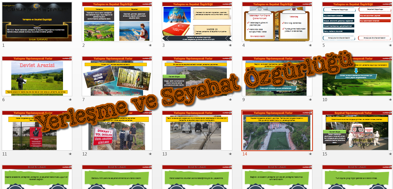 "SB.7.3.4. Temel haklardan yerleşme ve seyahat özgürlüğünün kısıtlanması halinde ortaya çıkacak olumsuz durumlara örnekler gösterir." kazanımı için hazırlanan sunudur.