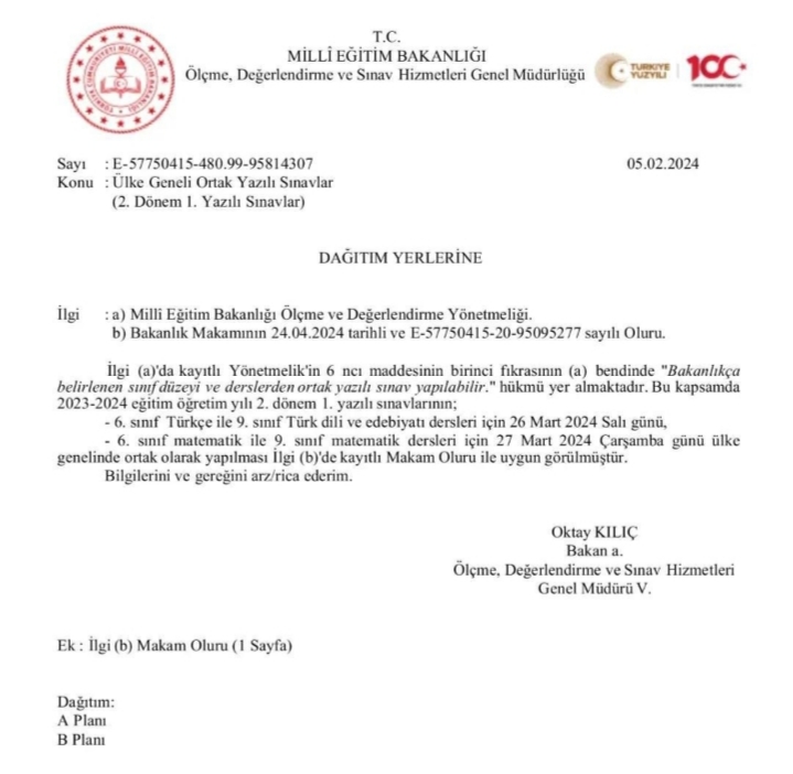 Milli Eğitim Bakanlığı 5 Şubat 2024 tarihli Dağıtım yerlerine gönderdiği ‘Ülke Geneli Ortak Yazılı Sınavlar’ konulu resmi yazısında 2. Dönem 1. Yazılı Sınavların tarihlerini açıkladı.