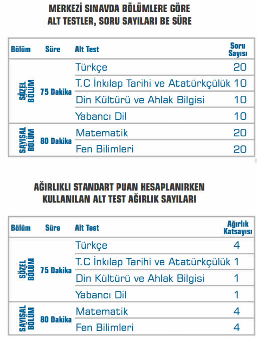 - Sözel bölümde, 8. sınıf Türkçe, Din Kültürü ve Ahlak Bilgisi, T. C. İnkılap Tarihi ve Atatürkçülük ile Yabancı Dil, sayısal bölümde ise Matematik ve Fen bilimlerinden sorular yöneltilmektedir.