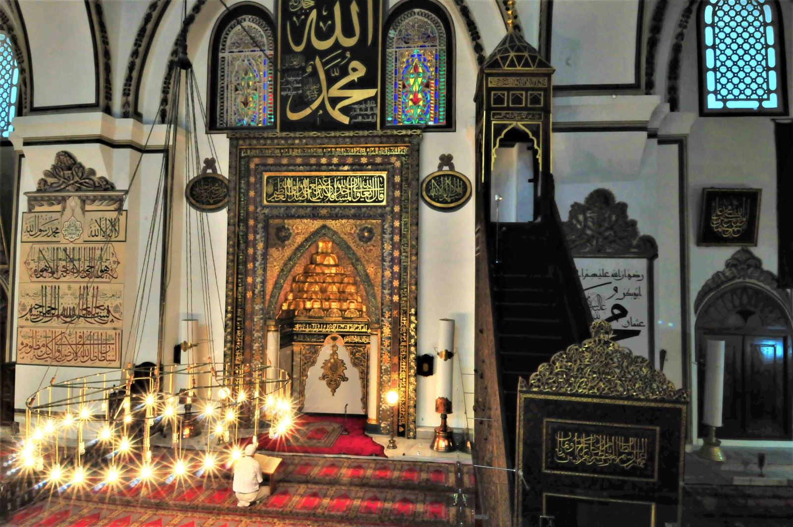 14. yüzyıl izlerini taşıyan sekiz sıraya düzenlenmiş istalaktitleri, dış yan köşelerde kum saati biçimli sütunceleri ile zengin görünümlü olan mihrap 1751 yılında tamamlanmıştır. Mihrabın sol tarafında mihrabı yapan Mehmet ustanın adı yazılıdır. Ceviz ağacından yapılmış ve siyah renge boyanmış olan minber, eşine az rastlanır bir sanat eseridir. Kapısı üzerinde bulunan 0.40 x 1 metre boyutlarındaki kitabede, Yıldırım Bayezid’in emri ile 1400 yılında tamamlandığı belirtilmektedir. Minber, Manisa da Saruhanlı İshak Bey’in 1379 tarihli Ulu Camii minberini yapan Antepli Hacı Mehmet b. Abdülaziz el Dukki’nin eseridir. Bu bilgiyi veren yazı, minberin sağ korkuluğunda dikey olarak yazılmıştır. Kündekari sanatının etkileri görülen eser, tutkal ve çivi kullanılmadan geometrik şekilde oyularak birbirine geçme tekniği ile meydana getirilmiştir. Doğu yüzünde bazı çıkıntıları vardır ve bunların güneş sistemi ile gezegenler olduğu söylenir. Üzerindeki işlemeler ile minber, Osmanlı mimari üslubuna geçişin önemli eserleri arasındadır.
