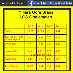 2018 2019 2020 ve 2021 yıllarında yapılan LGS’de derslere göre öğrencilerin yaptıkları ortalamalardır.