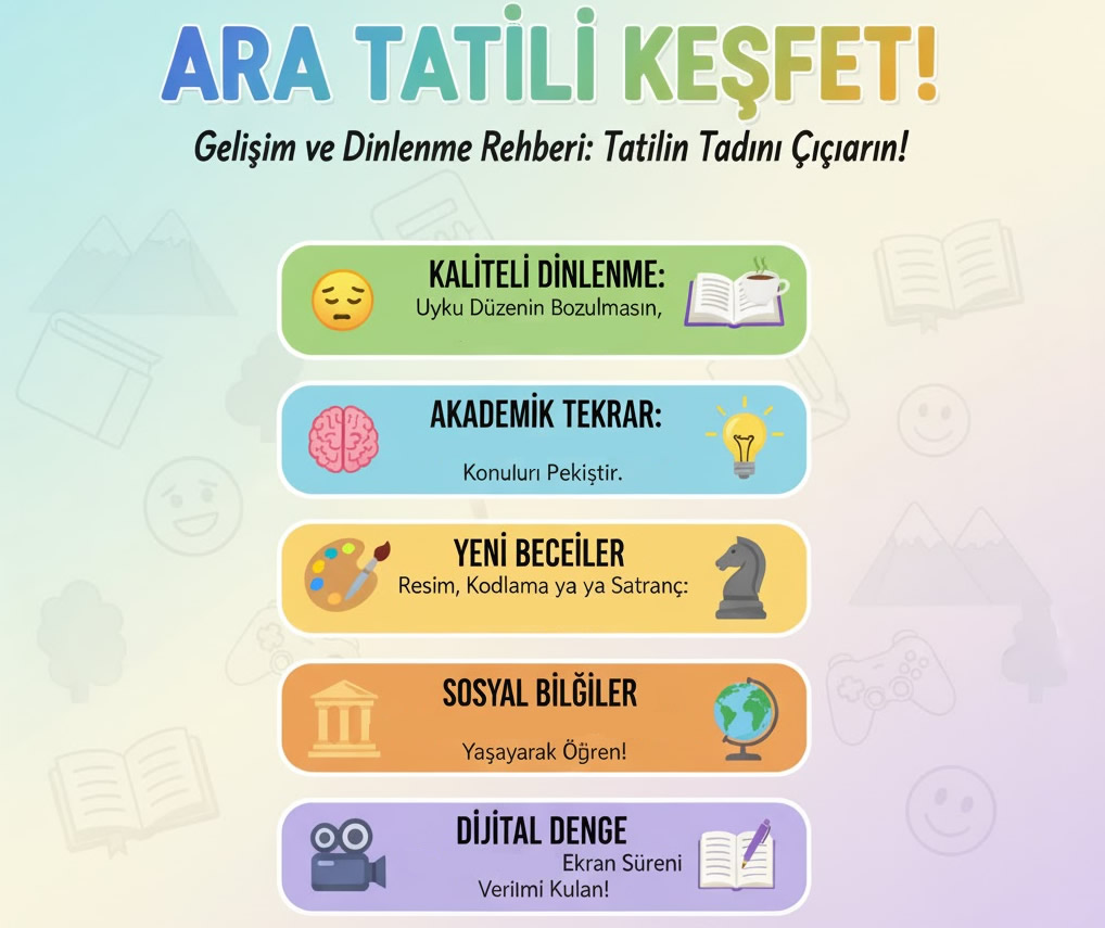 Yoğun bir dönemin ardından ara tatile girdiniz. Bu süre, sadece dinlenmekle kalmayıp, kişisel ilgi alanlarınızı keşfetmek ve öğrenme yolculuğunuza eğlenceli aktivitelerle devam etmek için eşsiz bir zamandır. İşte tatilinizi en verimli ve keyifli şekilde değerlendirmeniz için bazı öneriler: