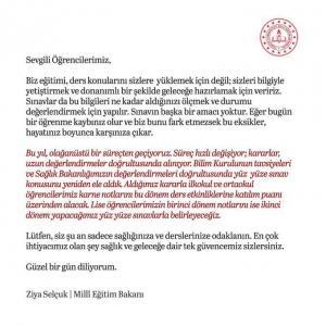 Bu yıl, olağanüstü bir süreçten geçiyoruz Süreç hızlı değişiyor; kararlar, uzun değerlendirmeler doğrultusunda alınıyor. Bilim Kurulunun tavsiyeleri ve Sağlık Bakanlığımızın değerlendirmeleri doğrultusunda yüz yüze sınav konusunu yeniden ele aldık Aldığımız kararla ilkokul ve ortaokul öğrencilerimiz karne notlarım bu dönem ders etkinliklerine katılım puanı üzerinden alacak. Lise öğrencilerimizin birinci dönem notların ise ikinci dönem yapacağımız yüz yüze sınavlarla belirleyeceğiz.