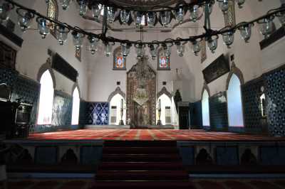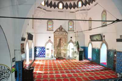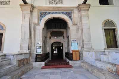 From the construction inscription on the door belt, it is understood that Murat II built the mosque in 1425-26. It is the last sultan mosque constructed in Bursa and is also the first example of a several units sultan mosque. Unlike previous mosques, the two domes of this mosque are equally high. The entrance roof of the mosque is the lower part of the walls of the main room; there are decorated with dark blue and turquoise colored hexagonal china. One of the two minarets was demolished in the earthquake of 1855; The one on the northwest corner is the old one and the other the new one. The mihrab was rebuilt in a rococo style after the fire in the early 18th century. The portico’s head was adorned with brick-lined geometric patterns and cherry-blue stars. To the right of the entrance there is a blue lightning sign. These symbolized the fact that Murat II striked his enemies like a lightning. The dervish rozette on the right side of the door also indicates that the dervishes want there to be a place where to stay. It is believed that the holes filled with lead resembling a sawtooth are a signature of workers working on the construction of the mosque. (Source: Bursa Provincial Directorate of Culture and Tourism)