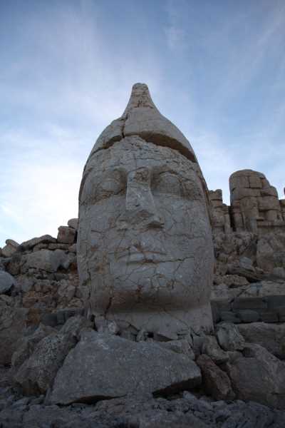 Yaklaşık 10 metre yüksekliğindeki tahtlar üzerinde sıralar halinde oturmuş dev kral ve tanrı heykelleri yer alır. Heykellerin yüzleri güneşe doğru bakmaktadır. Bu terasta sırasıyla Kommagene Krallığı’nın gökyüzü hakimiyetini temsil eden koruyucu kartal, krallığın yeryüzü hakimiyetini temsil eden koruyucu aslan, Kommagene Kralı I. Antiochos, Kommagene- (Tyche), Zeus – Oromastes, Apollon- Mithras ve Herakles- Artagnes heykelleri yer alır. Tahtların arkasında 234 satırdan oluşan Kral Antiochos’un dini ve sosyal içerikli vasiyeti (Nomos) bulunmaktadır. Terasın kuzey ve güneyinde Kommagene Krallığı’nın Pers soyuna ait krallarının kabartma stelleri bulunmaktadır. Yine bu terasta heykellerin önünde ateş sunağı (Altar) ve onun yanında oturur biçimde bir aslan heykeli bulunmaktadır. Nemrut’ta güneşin doğuşu bu terastan izlenmektedir.