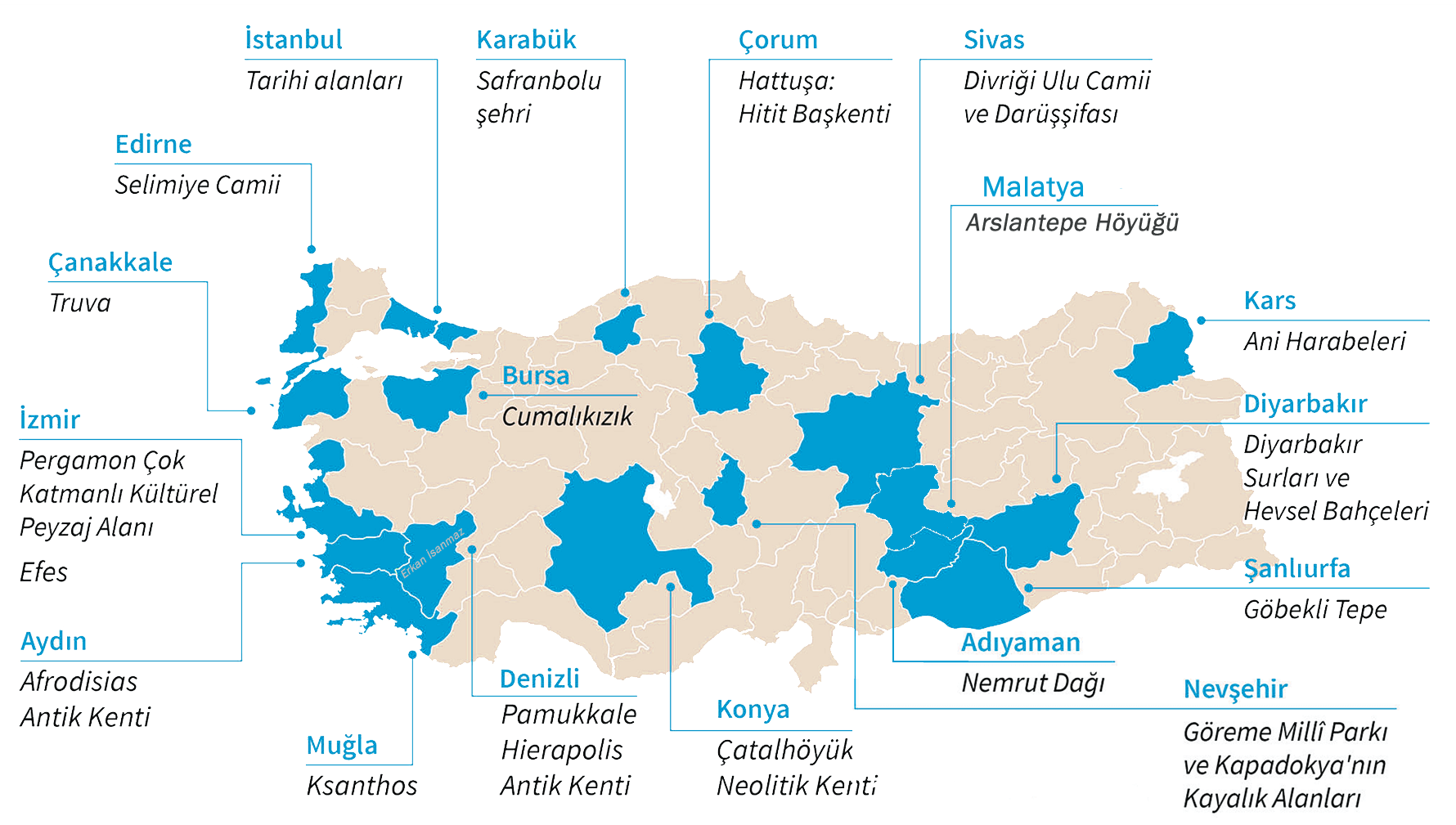 İşte yeni eklenen Arslantepe ile birlikte ülkemizde yer alan Dünya Ortak miras Listesinin bulunduğu yerler ve isimleri